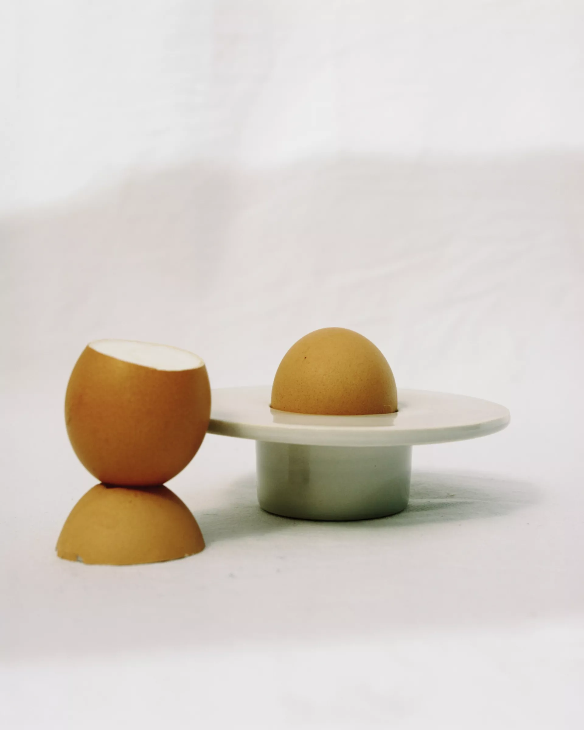 Le bol Mini-Maxi 02 est réversible. Il peut s’utiliser seul comme coquetier dans un sens ou s’empiler sur la tour de bols dans l'autre. Façonné à la main, au tour, en faïence, recouvert d'un émail satiné légèrement gris. Il porte les traces volontaires du geste : coulures, variations, légères transparences qui font de chaque pièce un original.