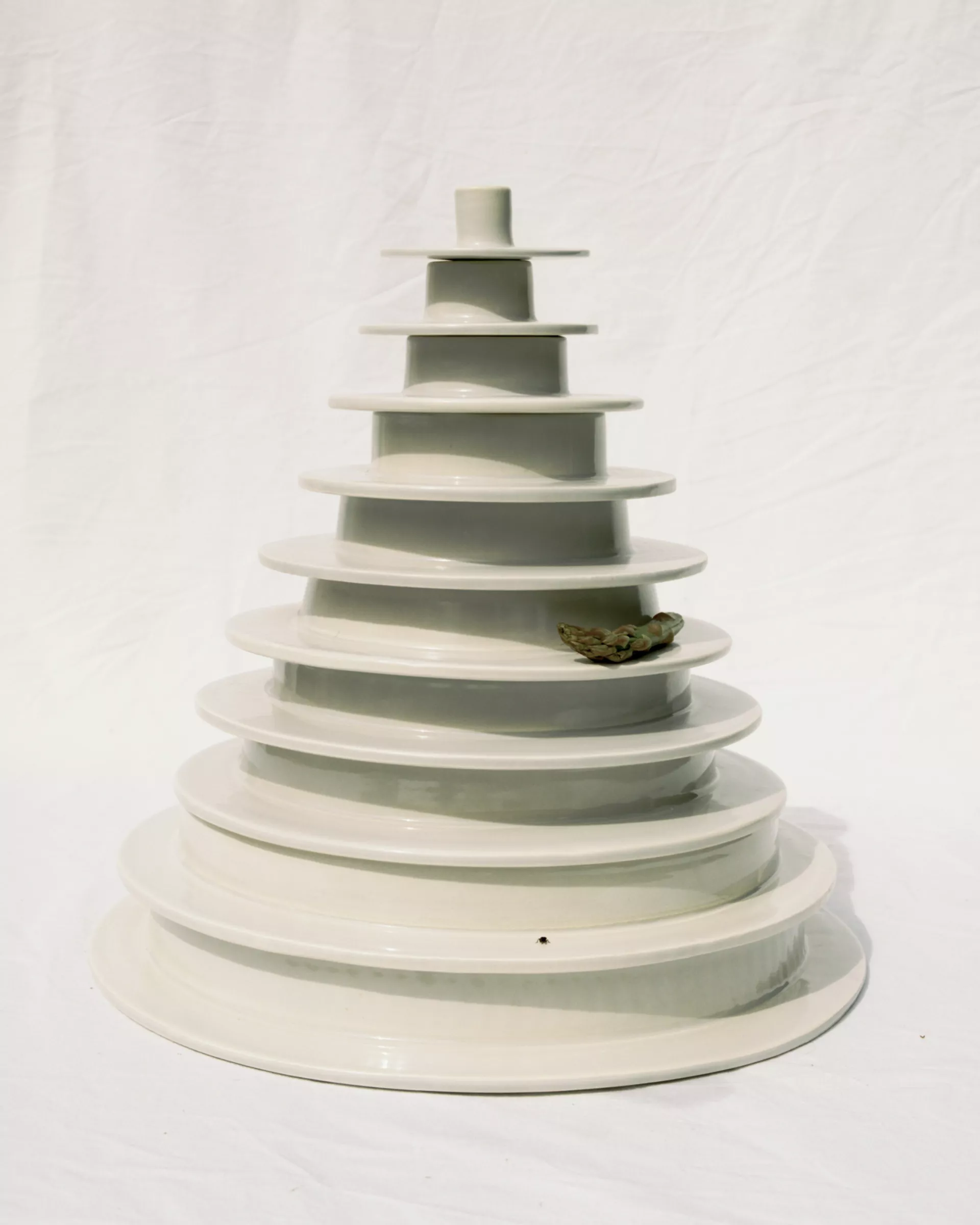 Le bol Mini-Maxi 08 est réversible. Il peut s’utiliser seul comme plat de partage dans un sens ou s’empiler sur la tour de bols dans l'autre. Façonné à la main, au tour, en faïence, recouvert d'un émail satiné légèrement gris. Il porte les traces volontaires du geste : coulures, variations, légères transparences qui font de chaque pièce un original.