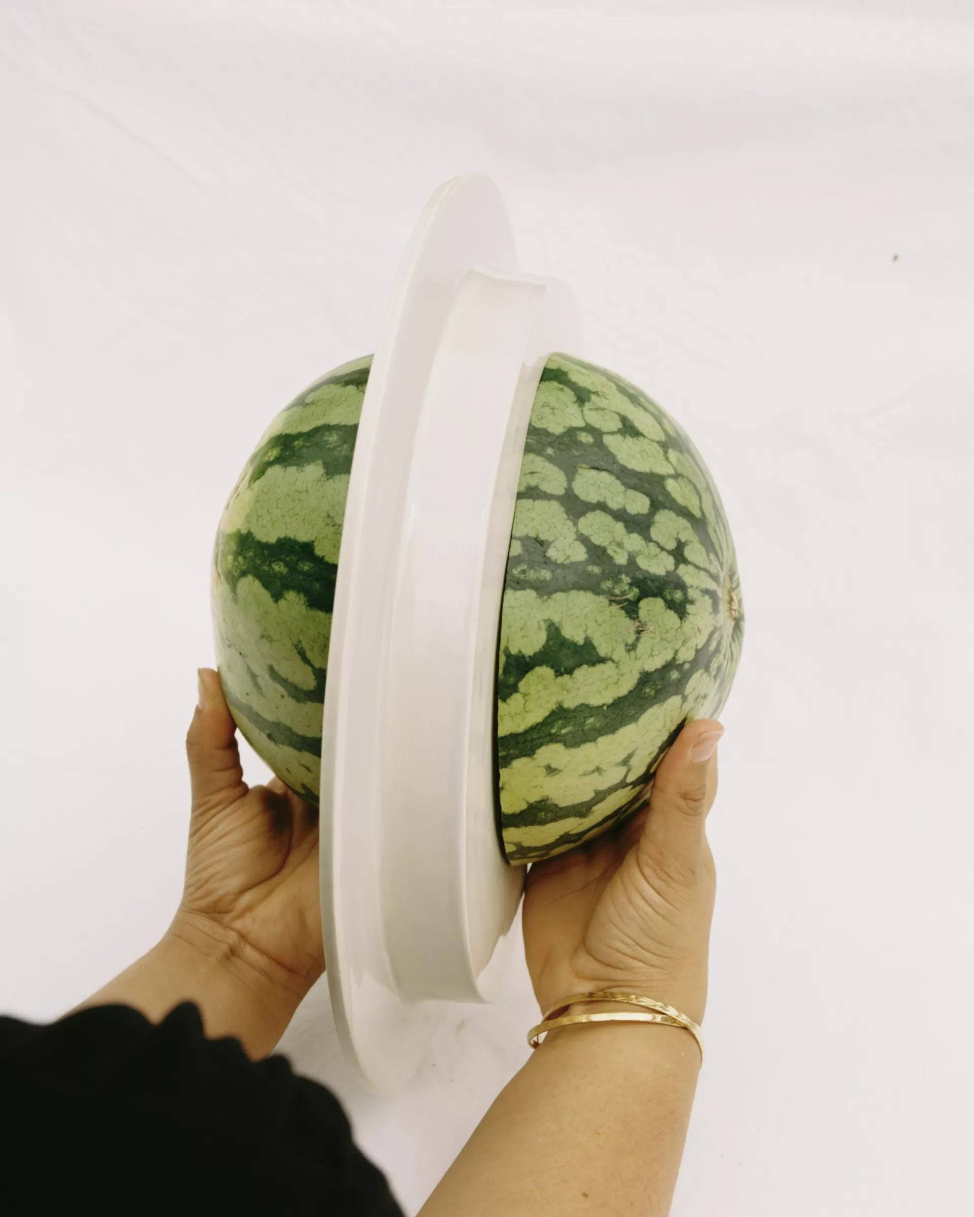 Le bol Mini-Maxi 09 est réversible. Il peut s’utiliser seul pour accueillir des rondelles de pastèques dans un sens ou s’empiler sur la tour de bols dans l'autre. Façonné à la main, au tour, en faïence, recouvert d'un émail satiné légèrement gris. Il porte les traces volontaires du geste : coulures, variations, légères transparences qui font de chaque pièce un original.