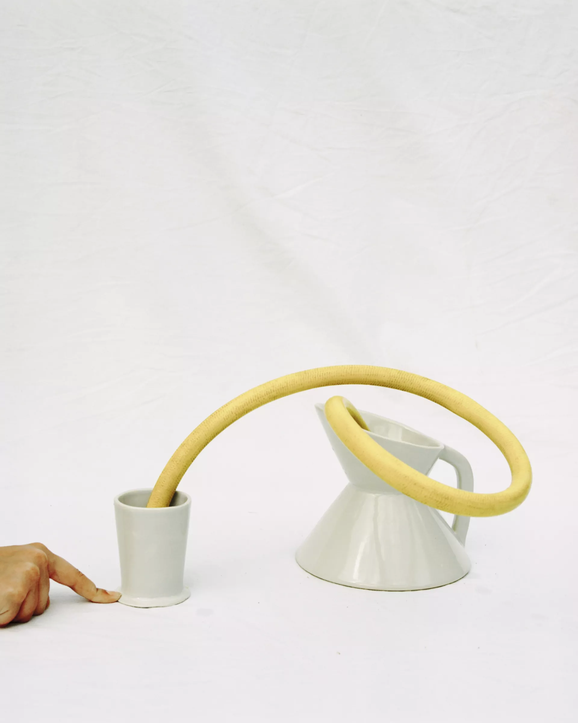 La Carafe Diabolo est la seule pièce de la collection qui n’est pas réversible. Façonnée à la main, au tour, en faïence, recouvertes d'un émail satiné légèrement gris. Elle porte les traces volontaires du geste : coulures, variations, légères transparences qui font de chaque pièce un original.