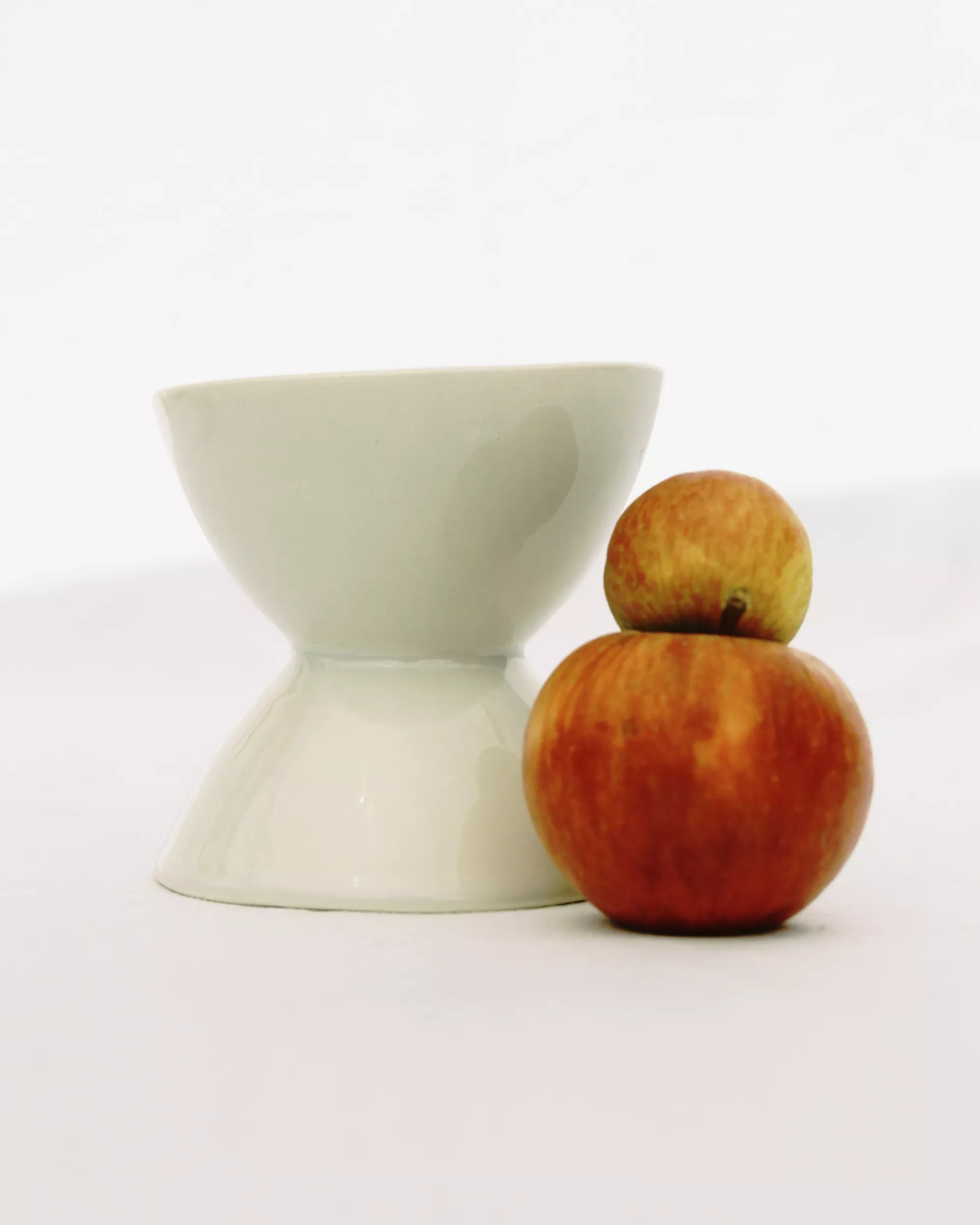 Le diabolo S est réversible. Il peut servir de chaque côté comme d’un bol sur une plateforme, pour entrée ou dessert. Façonné à la main, au tour, en faïence, recouverts d'un émail satiné légèrement gris. Il porte les traces volontaires du geste : coulures, variations, légères transparences qui font de chaque pièce un original.