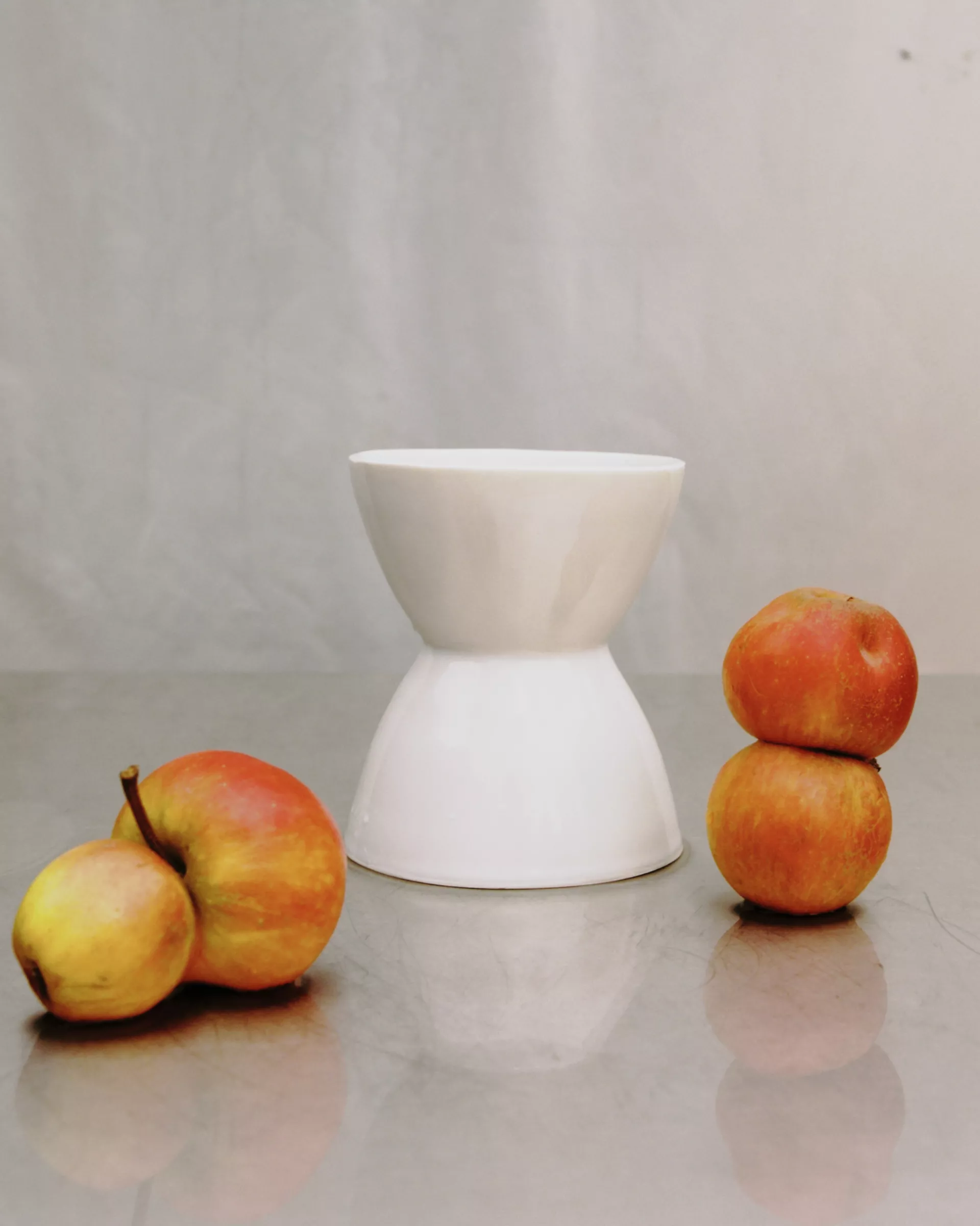 Le diabolo M est réversible. Il peut servir de chaque côté comme d’un bol sur une plateforme, pour des soupes. Façonné à la main, au tour, en faïence, recouverts d'un émail satiné légèrement gris. Il porte les traces volontaires du geste : coulures, variations, légères transparences qui font de chaque pièce un original.