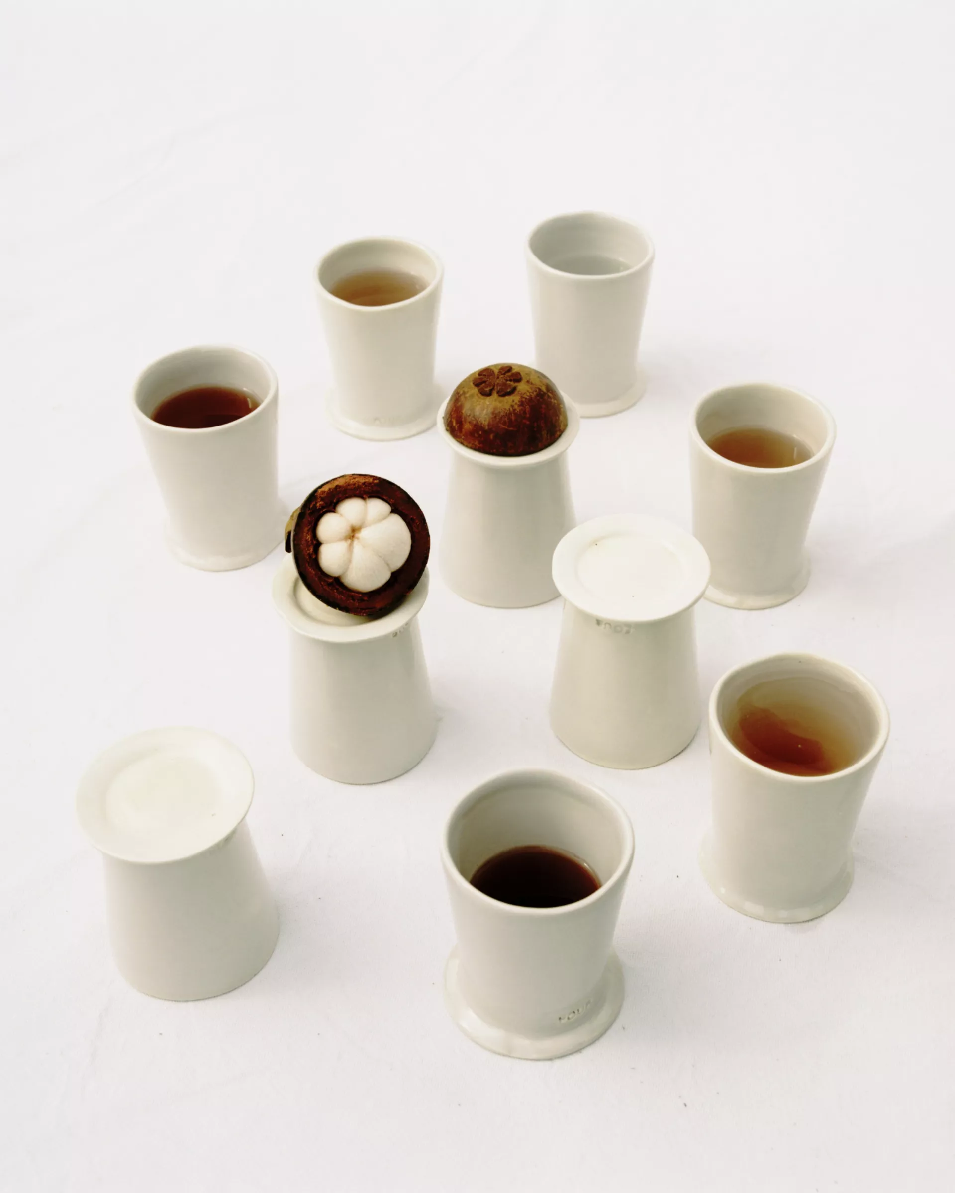 Le Verre-Assiette est réversible. Il peut servir de verre classique ou de petite assiette en hauteur. Façonné à la main, au tour, en faïence, recouvertes d'un émail satiné légèrement gris. Il porte les traces volontaires du geste : coulures, variations, légères transparences qui font de chaque pièce un original.